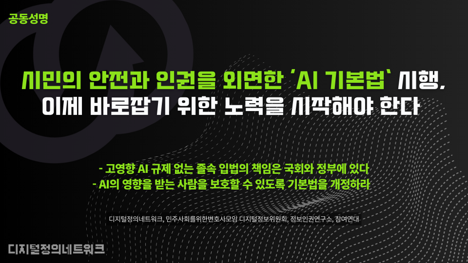 시민의 안전과 인권을 외면한 ‘AI 기본법’ 시행, 이제 바로잡기 위한 노력을 시작해야 한다 – 고영향 AI 규제 없는 졸속 입법의 책임은 국회와 정부에 있다 – AI의 영향을 받는 사람을 보호할…